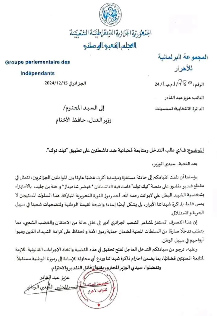 L’affaire a pris une dimension politique lorsqu’Aziz Abdelkader, parlementaire de l’Assemblée Populaire Nationale (APN), a décidé de porter l’affaire devant la justice. Dans un courrier officiel adressé au ministre de la Justice, Abdelkader exprime sa profonde indignation face à la vidéo. Il qualifie l’acte de diffamatoire envers l’histoire de l’Algérie et d’insulte à la mémoire des martyrs (« chahids »).