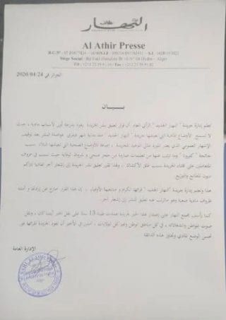 En effet, dans un communiqué rendu public, la direction du journal appartenant à la SARL El Athir presse, évoque comme raison de cette suspension, la situation financière difficile que traverse le journal, après la suspension de la publicité publique le mois de février passé.