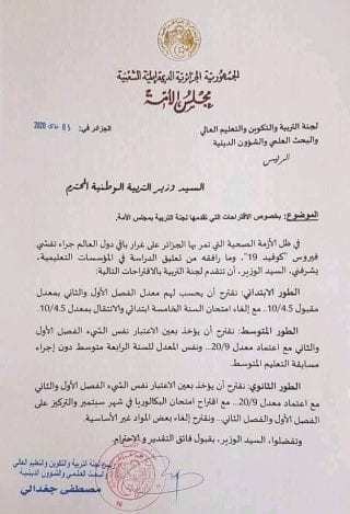 Les propositions comprenaient également l’annulation de l’examen d’enseignement primaire «Cinquième» et opter pour un passage avec une moyenne de 4,5 sur 10, en s’appuyant sur les notes du premier et du deuxième trimestre, en plus d’annuler l’examen de d’enseignement moyen «BEM» et de s’appuyer sur les notes du premier et du deuxième trimestre pour passer à l’enseignement secondaire.