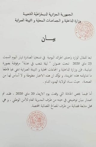 Le ministère a précisé que l’information est totalement fausse, erronée, et sans fondement et assure ainsi qu’ «un calme total a régné sur la wilaya d’Annaba».