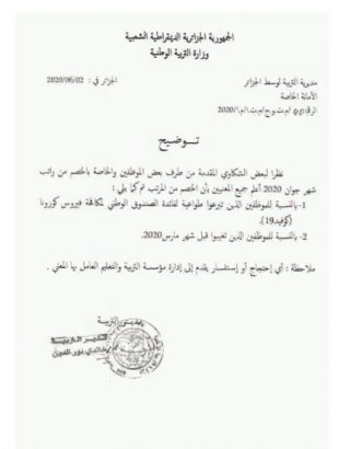 En effet, la Direction de l’éducation d’Alger Centre, a précisé dans le communiqué, que la ponction concerne les travailleurs qui ont fait un don volontaire au profit du Fonds national de lutte contre le Coronavirus, ainsi que les employés qui ont été absents bien avant le mois mars dernier.