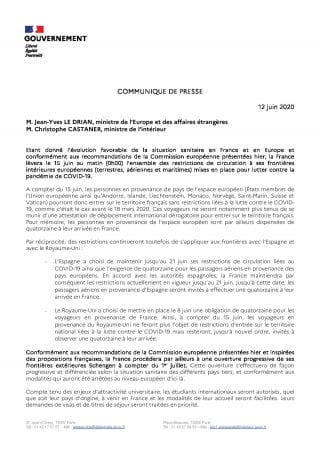Les ministres français des Affaires étrangères Jean-Yves Le Drian et de l’Intérieur Christophe Castaner ont annoncé dans un communiqué commun la levée des restrictions de circulation aux frontières de la France (terrestres, aériennes et maritimes) mises en place pour lutter contre la pandémie de COVID-19 le 15 juin prochain au matin.