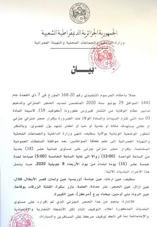 En vue de l’évolution de la situation épidémiologique dans la wilaya, le confinement sanitaire partiel sera à partir de 13 h 00 jusqu’à 05 h 00 du matin du lendemain, et ce à compter de demain mercredi 8 juillet 2020, et pour une durée de 15 jours.