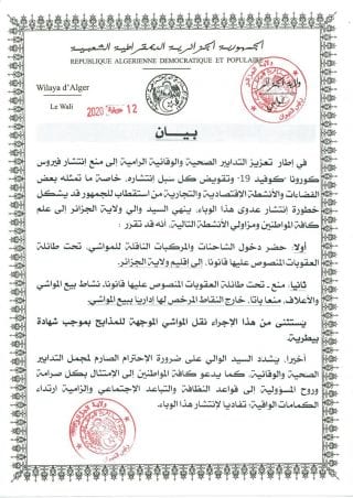 Dans le cadre du renforcement du dispositif de prévention et de la lutte contre la propagation de l’épidémie du coronavirus, le wali d’Alger, informe l’ensemble des citoyens des mesures suivantes :