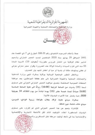 Le confinement partiel est imposé, pour une durée de 15 jours, à compter de demain mardi 14 juillet 2020, de 16 heures à 5 heures le lendemain, dans les communes de Biskra, Sidi Okba, Ouled Djellal, Tolga, Zribet El Oued, Doucen, Sidi Khaled, Chetma et Ain Naga.