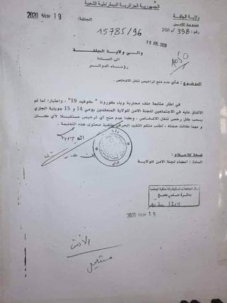 La décision concerne la suspension de délivrance de nouvelles autorisations de déplacement et le retrait des autorisations précédemment délivrées, et ce dans le cadre des mesures de lutte contre la propagation de l’épidémie du coronavirus dans la wilaya.