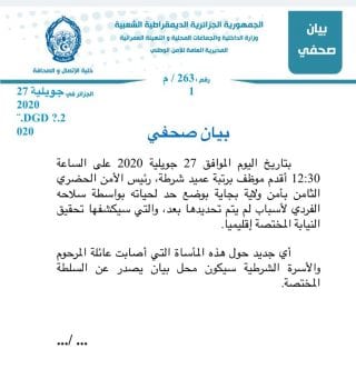 Selon le même communiqué, la victime s’agit d’un fonctionnaire de Police de grade de commissaire Principal, Chef de la 8ème Sureté Urbaine de la Sûreté de Wilaya de Béjaïa. La scène a eu lieu aux alentours de 12 h 30, dans son bureau à l’aide de son arme de service.