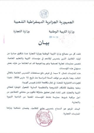 Rappelons que les parents d’élèves ont, à maintes reprises, dénoncé les demandes incessantes des établissements privées, pour s’acquitter des frais de scolarisation du troisième trimestre sous peine de ne pas avoir les bulletins et les dossiers de scolarité de leurs enfants.