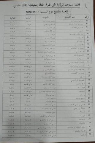 La direction des affaires religieuses de la wilaya de Bejaia, vient de publier la liste nominative des 61 mosquées concernées par la réouverture dès ce samedi 15 Août 2020 à travers le territoire de la wilaya.