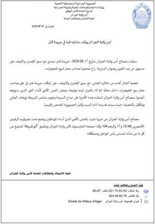 La vcitime Andelkrim ARHAB est âgé de 45 ans et père de deux enfants, l’homme était apprécié par tous pour son calme et sa sagesse, il a été assassiné suite a une tentative de vol raté, les faits se sont déroulé vers 15h30 dans le quartier paisible de Draria au niveau de la capitale, trois mis en cause s’étaient présenté à la « Bijouterie Karim » muni d’armes blanches dans le but de braquer le commerce. Le défunt, seul, a tenté de les en empêcher et suite à une lutte brutale, le jeune bijoutier a reçu plusieurs coups de couteau au niveau du torse de la part de la personne arrêtée, qui lui a coûté la vie.