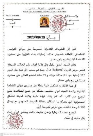 Le wali a tenu, par le biais de ce communiqué à apporter des précisions « suites aux informations relayées, notamment sur les réseaux sociaux, portant sur l’apparition de cas de Choléra au niveau de la circonscription administrative de Bordj Badji Mokhtar ».