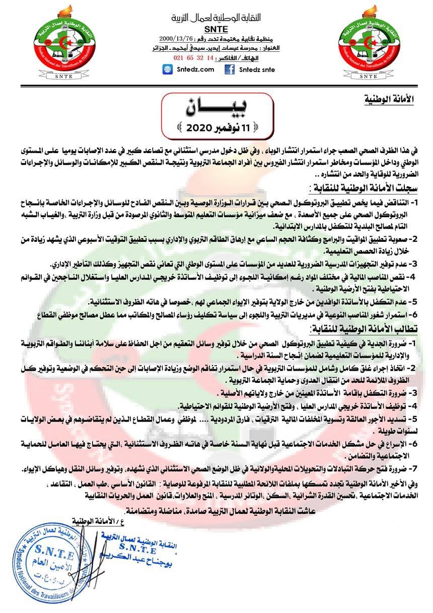 Ainsi, les signataires du communiqué du SNTE ont appelé « à la fermeture complète et généralisée des établissements scolaires, dans le cas ou la situation sanitaire ne s’améliorait pas, notamment face à la recrudescence des contaminations », et ce « jusqu’à ce que les conditions le permettent ».
