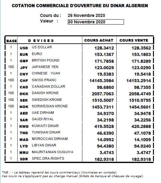 Selon les cotations officielles, l’euro s’échange désormais à 153,18 dinars à la vente et à 153.13 dinars à l’achat sur le marché officiel de la Banque d’Algérie. De son côté, le dollar reste stable, à un niveau élevé, qui s’élève à 128,35 dinars à la vente et à 128,34 dinars à l’achat.