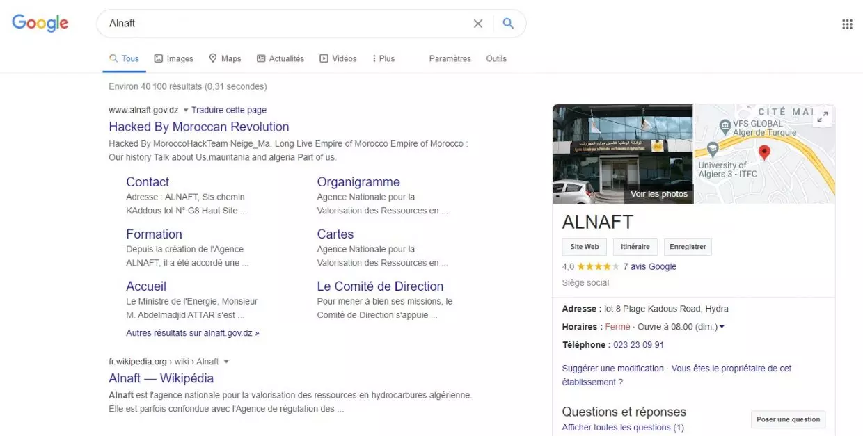 Selon les informations rapportées par plusieurs médias, dont le média arabophone Echourouk, plusieurs sites web Algériens officiels et gouvernementaux ont été piratés au cours des dernières 72 heures. Parmi ces sites figure celui de l’Agence nationale pour la valorisation des ressources en hydrocarbures algérienne « Alnaft ».