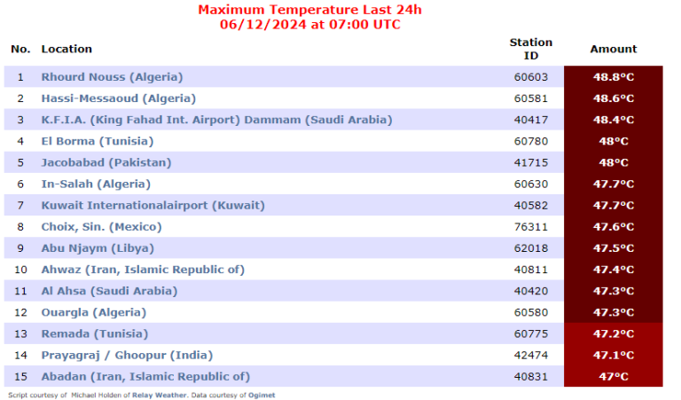Les autres villes algériennes, comme Hassi Messaoud, une capitale pétrolière, ont également été affectées, enregistrant des températures de 48,6°C. Ain Salah, une ville saharienne, a connu 47,7°C, tandis qu’Ouargla, autre grande ville du sud, a frôlé les 47,3°C.