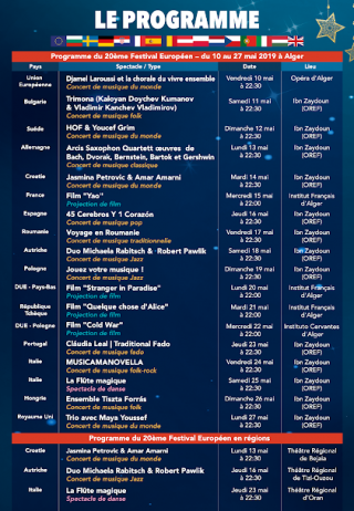 La Délégation de l’Union européenne en Algérie, en coopération avec les services culturels des Etats membres, organisent la 20ème édition du Festival européen du 10 au 27 mai 2019 à Alger, Oran, Bejaia et Tizi Ouzou.