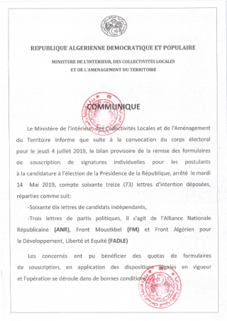 « Le Ministère de l’intérieur, des Collectivités Locales et de l’Aménagement du Territoire informe que suite à la convocation du corps électoral pour le jeudi 4 juillet 2019, le bilan provisoire de la remise des formulaires de souscription de signatures individuelles pour les postulants à la candidature à l’élection de la Présidence de la République, arrêté le mardi 14 Mai 2019, compte soixante treize (73) lettres d’intention déposées », li-t-on sur le communiqué.