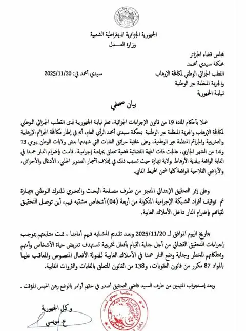 Selon le communiqué du Parquet près le Tribunal de Sidi M’hamed, la brigade d’enquête du Gendarmerie nationale de Tipaza a identifié et interpellé quatre membres d’une bande criminelle suspectée d’avoir délibérément mis le feu dans la forêt de Larhat.
