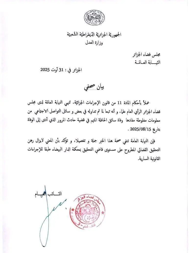 L’individu « demeure sous le coup d’une enquête judiciaire instruite par le juge d’instruction près le tribunal de Dar El Beïda. Conformément aux procédures légales en vigueur ». Cette formulation confirme que le mis en cause est toujours sous le contrôle de la justice, son sort judiciaire étant entre les mains de la magistrature instructrice. L’enquête se poursuit donc normalement, suivant méticuleusement les procédures établies par la loi.