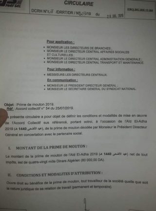 A l’occasion de l’aid el-Adha, les travailleurs de Naftal recevront une prime de 80 000 DA. C’est dans une circulaire datant de ce dimanche, 28 juillet, que l’entreprise publique a annoncé à ses employés cette nouvelle qui est le résultat de l’accord collectif du 25 juillet dernier et dans lequel il a été décidé l’octroi de cette « prime du mouton décidée par Monsieur le Président directeur général en concertation avec le partenaire social » tel indiqué dans la circulaire dont « Reporters » s’est procuré (voir en dessous).