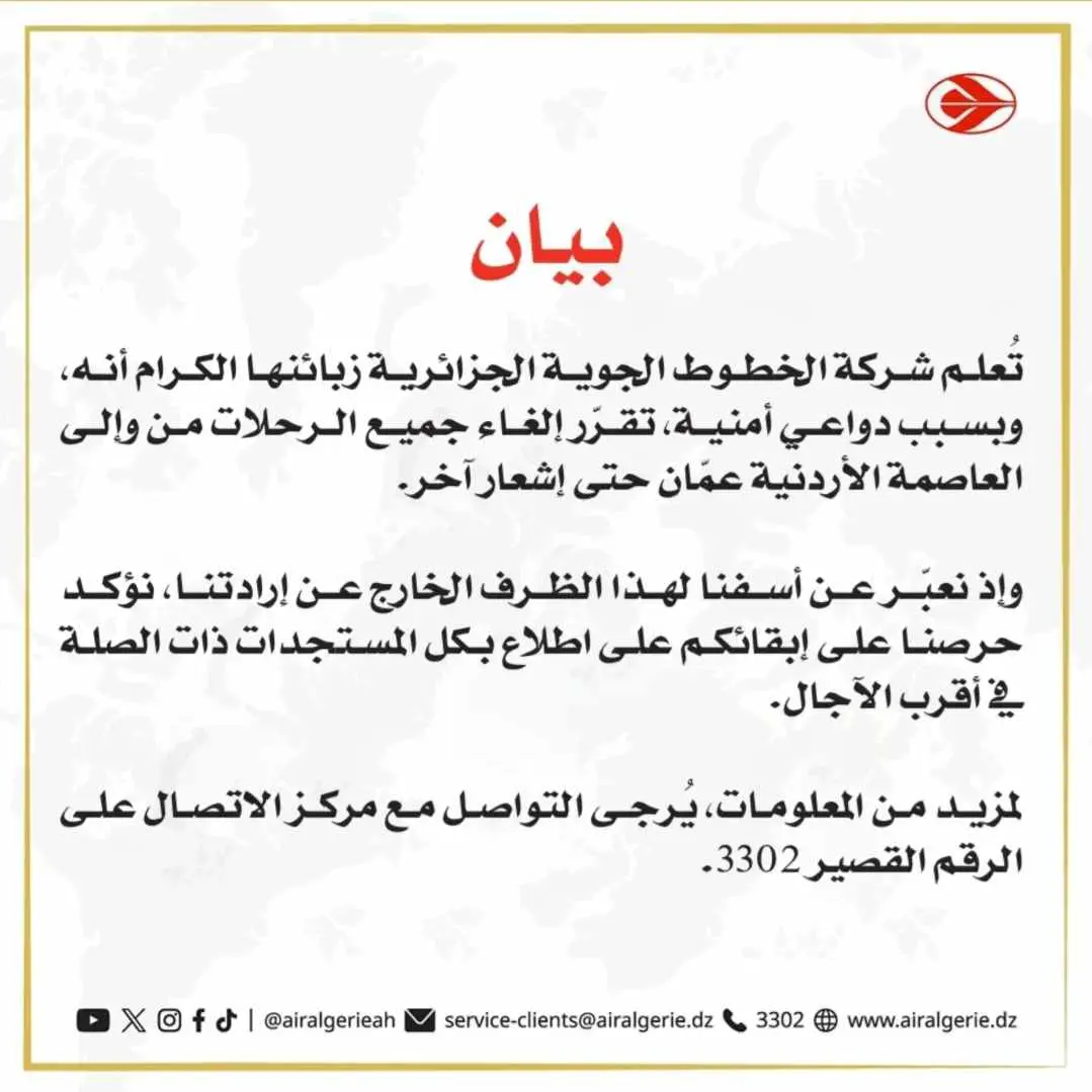 Air Algérie annonce la suspension immédiate de tous ses vols à destination et en provenance d’Amman, la capitale jordanienne.