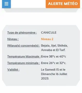 L’Office National de Météorologie a indiqué que des pics à 40 °C peuvent être enregistrés ce samedi dans les wilayas de Bejaia, Jijel, Skikda, Annaba et El Taref. Ces wilayas sont en alerte caniculaire niveau 2.