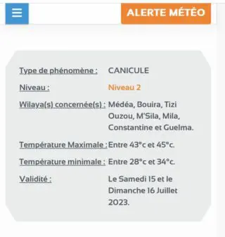 Dans son site officiel, l’Office National de Météorologie a publié une alerte météorologique qui concerne les wilayas de Médéa, Bouira, Tizi-Ouzou, M’sila, Mila, Constantine et Guelma, indique que les températures atteindront les 45 °C. L’ONM place ces régions en vigilance orange.