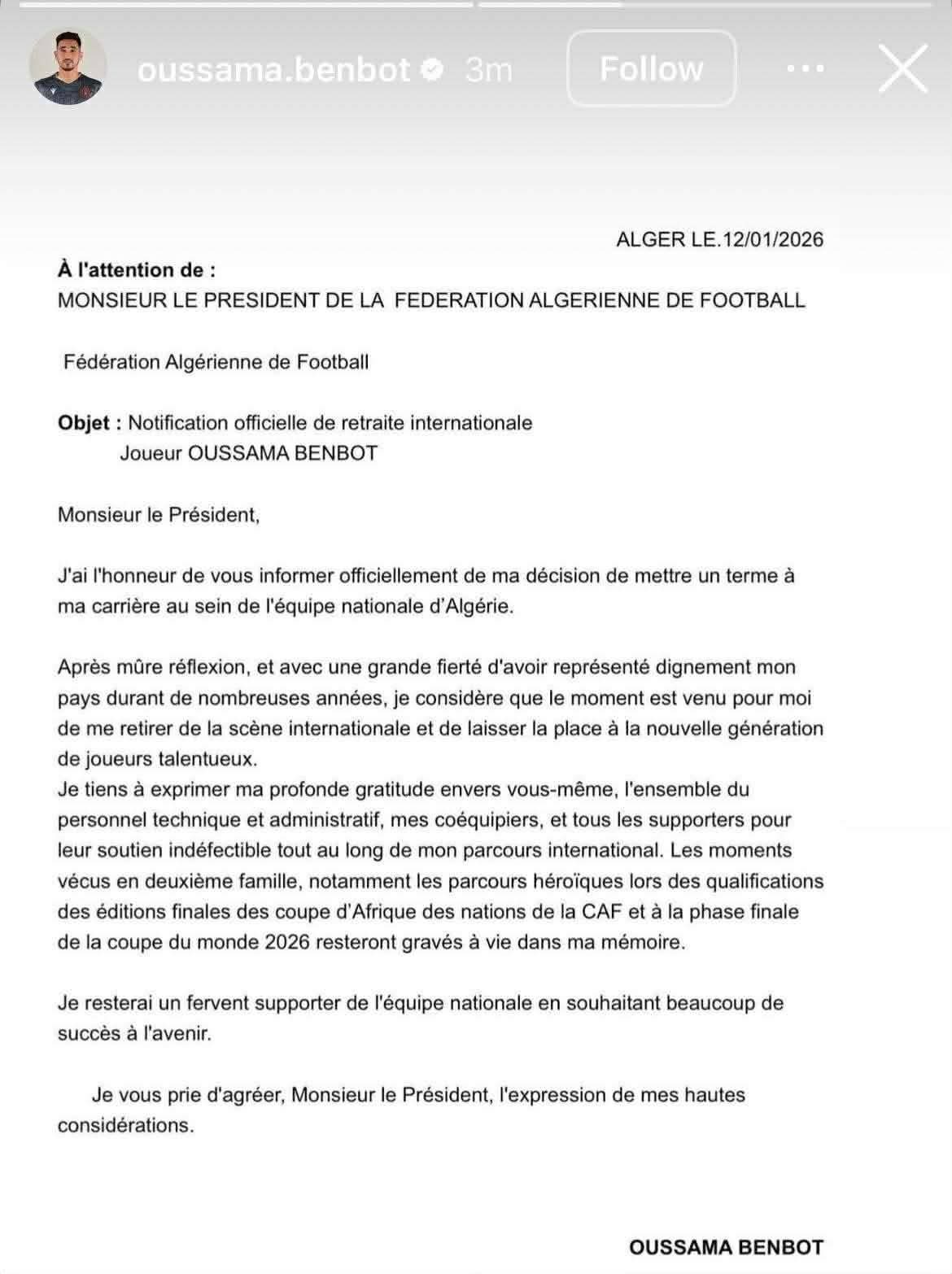Un courrier que le joueur a lui-même rendu public en le partageant dans une story sur son compte Instagram, provoquant de nombreuses réactions au sein de la famille du football algérien.