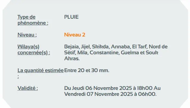 🟢 À LIRE AUSSI : Prévisions météo du jeudi 6 novembre : la pluie signe son retour en Algérie pour clore la semaine