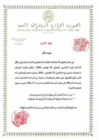 Comme chaque année, le 1er novembre est célébré au niveau national, avec différentes manifestations culturelles organisées à travers le pays. En vue de la célébration cette année du 68ème anniversaire du déclenchement de la guerre de libération, la wilaya d’Alger annonce que plusieurs tronçons de route seront coupés le mardi 1er novembre 2022, au niveau du cœur de la capitale.