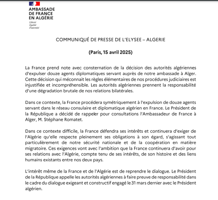 Pour Alger, cette déclaration ne fait que confirmer une attitude jugée condescendante et déséquilibrée. Une source diplomatique algérienne a indiqué que la décision d’expulser les agents français est « ferme et souveraine », dans le but de « protéger l’intégrité des institutions algériennes à l’étranger ».
