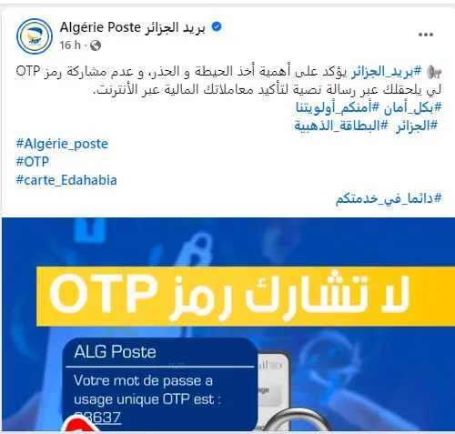Alger, le 26 septembre 2024 – Face à la recrudescence des tentatives de fraude en ligne, Algérie Poste a lancé un appel à ses clients. L’établissement alerte sur les risques liés à la divulgation du code OTP, un élément clé de la procédure de récupération de la carte Eddahabia.