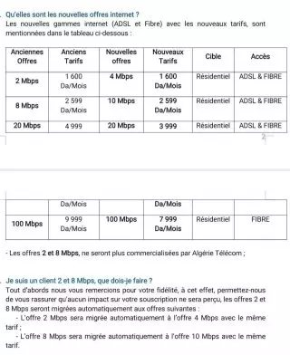 Tandis que, le débit de la connexion Internet de 8 Mbps passera à 10 Mbps, avec le même tarif de 2599 Da/mois.