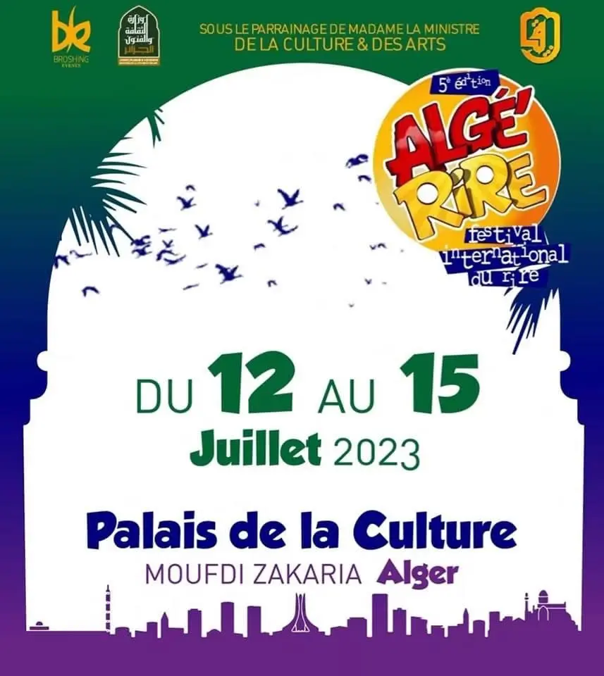 Algé’Rire Festival signe son grand retour à Alger, après une rupture de sept ans. Placée sous le Parrainage de Madame la Ministre de la Culture et des Arts, le Dr. Soraya Mouloudji, cette 5e édition aura lieu du 12 au 15 juillet 2023 au Palais de la culture « Moufdi Zakaria ».