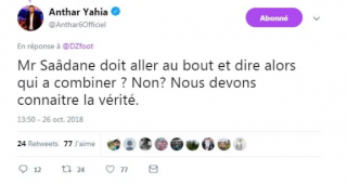 Antar Yahia a ainsi appelé Rabah Saâdane à dévoiler les noms des personnes responsables du trucage du résultat dudit match, lors duquel la sélection algérienne s’était inclinée sur le score de 4 buts à 0 face à l’Égypte.