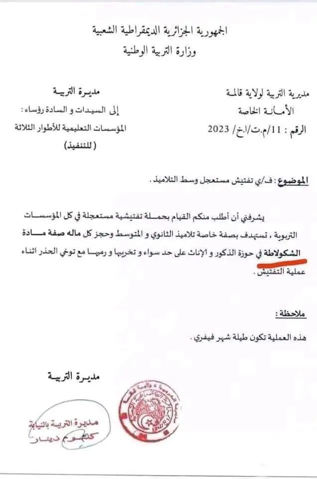 Cette note précise également que cette opération de fouille en vue de confisquer du chocolat aux élèves de la wilaya de Guelma, est valable tout au long de ce mois de février 2023.