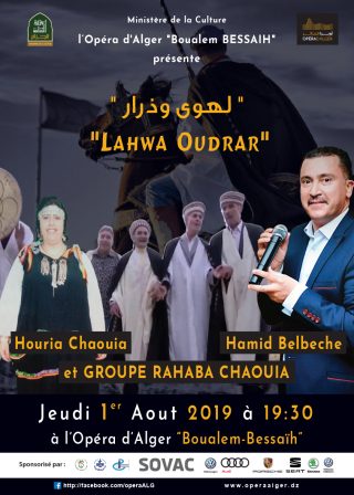 Le premier concert intitulé « Lahwa Oudrar », se tiendra le jeudi 01 août à 19h30 et sera animé par Houria Chaouia, Hamid Belbeche et groupe Rahaba Chaouia.