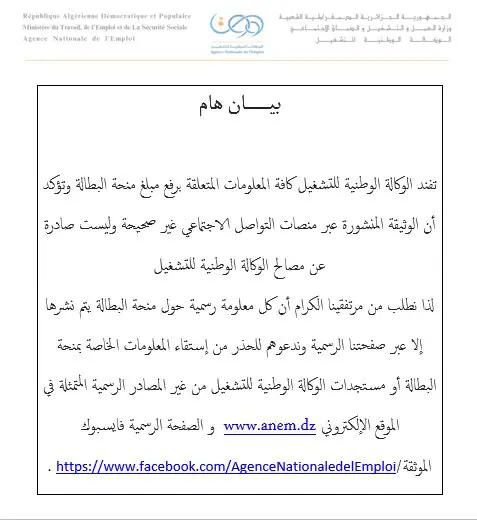 D’ailleurs, l’Agence nationale de l’emploi a saisi l’occasion pour rappeler le fait que toutes les informations officielles concernant l’allocation chômage sont publiées sur sa page Facebook officielle ou sur son site internet (www.anem.dz).