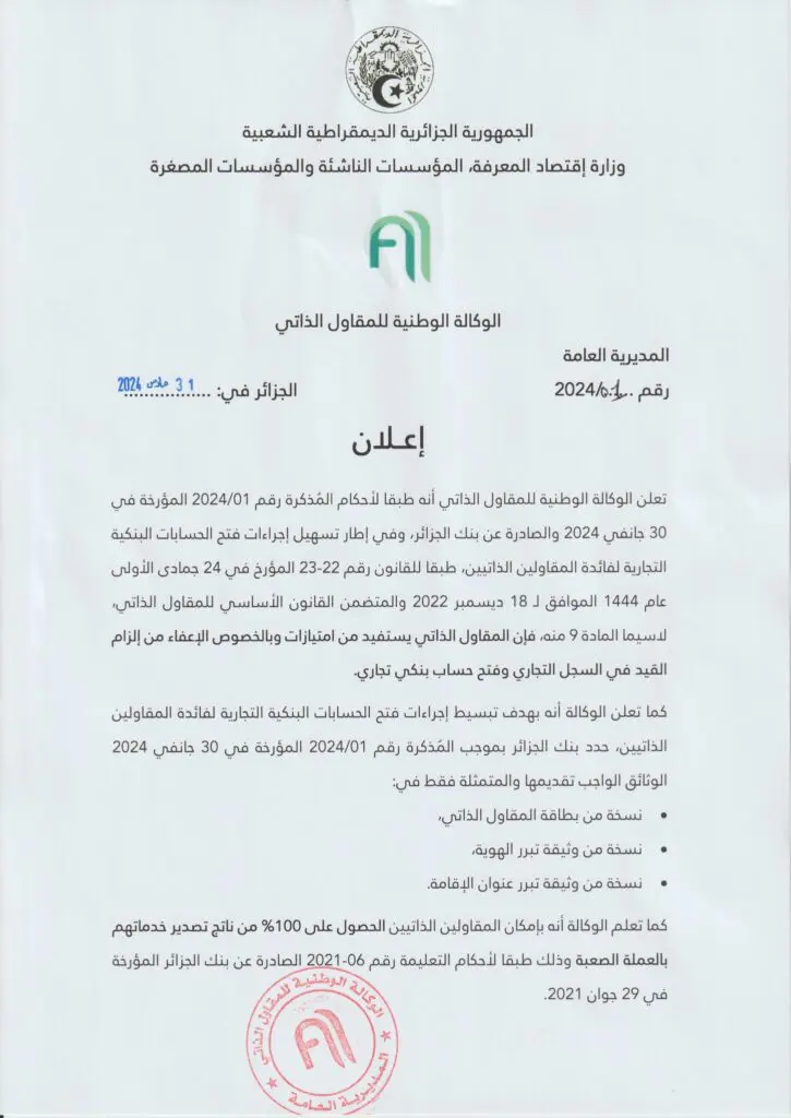 Cette réforme de l’ANAE, élaborée en conformité avec les textes réglementaire de la banque d’Algérie, s’inscrit dans le cadre des mesures qui vise à encourager l’auto-entreprenariat en Algérie.