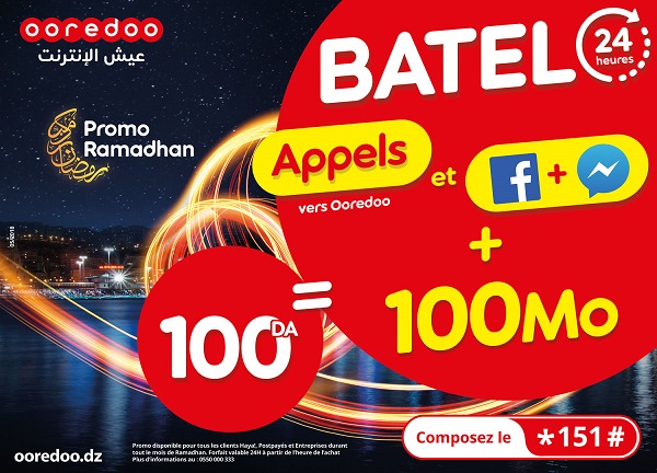 Pour répondre aux attentes des clients voulant bénéficier d’appels à moindres coûts durant ce mois sacré, Ooredoo lance également son offre promotionnelle « 60 Min vers Tous à 100 DA » offrant 60 minutes d’appels vers tous les réseaux nationaux valables 24 heures à partir de l’heure d’achat pour 100 DA seulement.