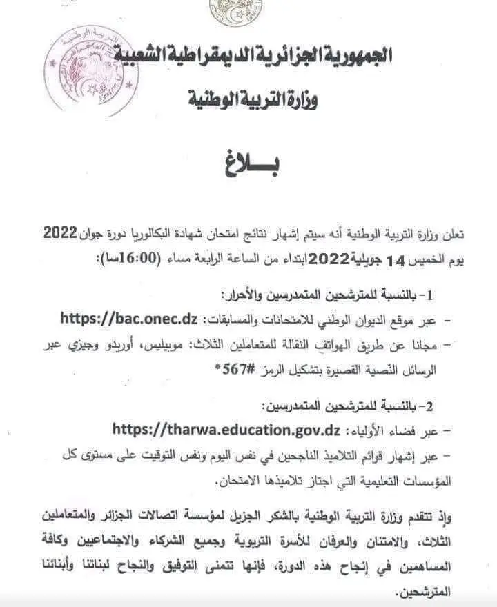 Selon un communiqué relayé par le média arabophone Echourouk Online ; le département du Ministre Abdelhakim Belabed aurait annoncé que les résultats du BAC 2022 seront affichés le 14 juillet prochain. Et ce, à partir de 16 heures.