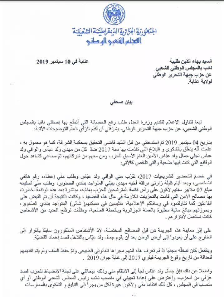 « C’était en 2017, l’année où Djamel Ould Abbes et sa bande étaient à l’apogée du pouvoir et de la domination. À cette époque, heureusement révolue, d’aucun de l’extérieur du parti ou de l’intérieur ne pouvait oser les déranger, eux et leurs malveillants stratagèmes. Aujourd’hui, contre toute attente, après de moult services rendus à la patrie en tant que dénonciateur, plaignant et surtout, eu égard à ma collaboration avec la police judiciaire, je me retrouve l’objet d’une demande de levée de mon immunité parlementaire par le ministère de la Justice »