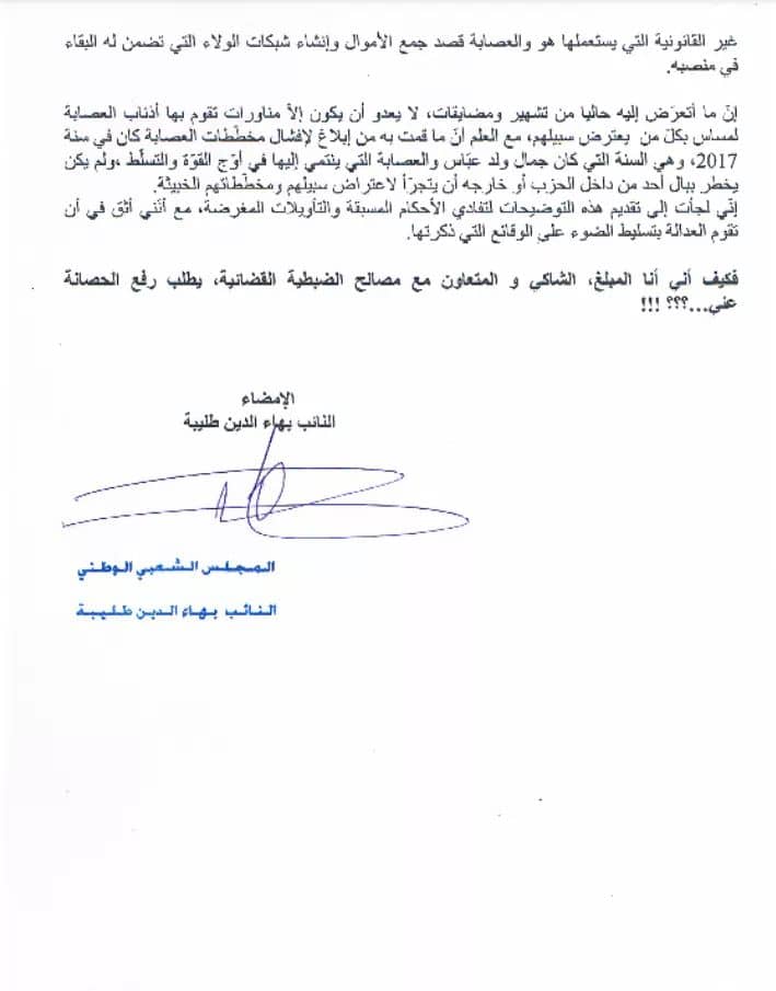 « Par ses mesures de vengeance, Ould Abbes voulait présenter mon cas tel un exemple pour quiconque qui ose éventuellement dénoncer ou se plaindre des pratiques délictueuses que lui-même et sa bande adoptent pour escamoter des fonds illicites et mette en place des réseaux de « soumis » qui lui assurent la pérennité de son poste de SG », affirme Tliba.
