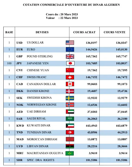 Sur le marché officiel de la Banque d’Algérie, les cours de change indiquent que l’unité du dollar américain s’échange contre 136.01 dinars algériens à l’achat et contre 136.03 dinars algériens à la vente. De plus, les cotations commerciales de la Banque affichent également que le dollar canadien unique s’est établi à 99.06 dinars algériens à l’achat et à 99.10 dinars algériens à la vente.