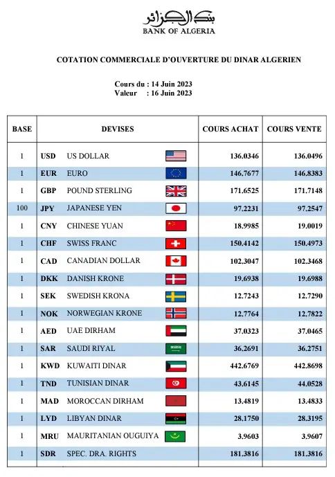 Ainsi, voici un tableau récapitulant les cours de change du dinar algérien face aux principales devises étrangères en Banque et au marché noir pour ce jeudi 15 juin 2023 :