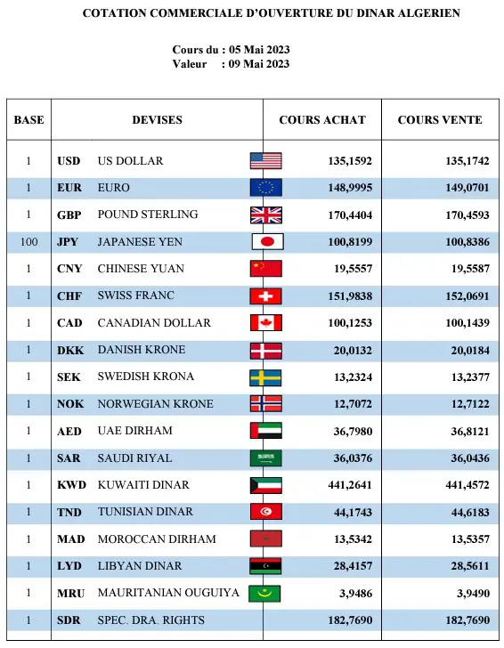 Pour récapituler, vous trouverez ci-dessous un tableau résumant les cours de change du dinar algérien face aux principales devises étrangères en Banque et au marché noir pour ce lundi 8 mai 2023 :