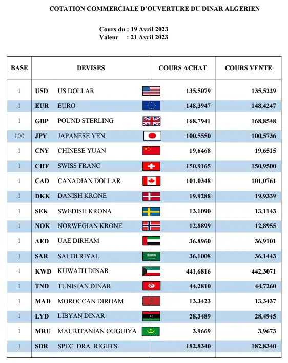 Ainsi, dans le tableau ci-dessous, nous vous résumons les taux de change du dinar algérien face aux principales devises étrangères ce jeudi 20 avril 2023 :