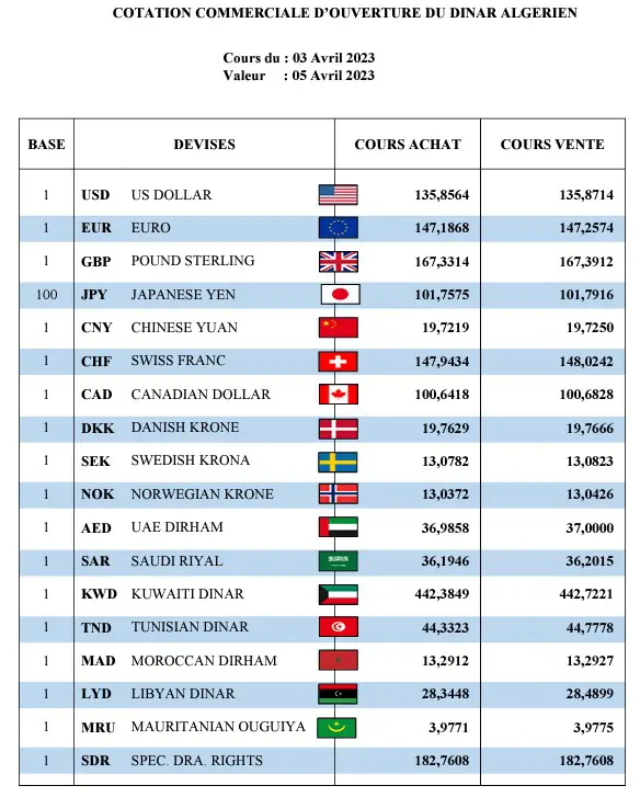 Les cotations commerciales d’ouverture du dinar algérien à la Banque d’Algérie du 03 au 05 avril 2023 indiquent que la monnaie européenne unique s’achète à 147.18 dinars algériens et se vend à 147.25 dinars algériens. De son côté, la monnaie américaine unique peut être achetée pour 135.85 dinars algériens et vendue pour 135.87 dinars algériens, et ce, sur le marché officiel de la Banque d’Algérie.