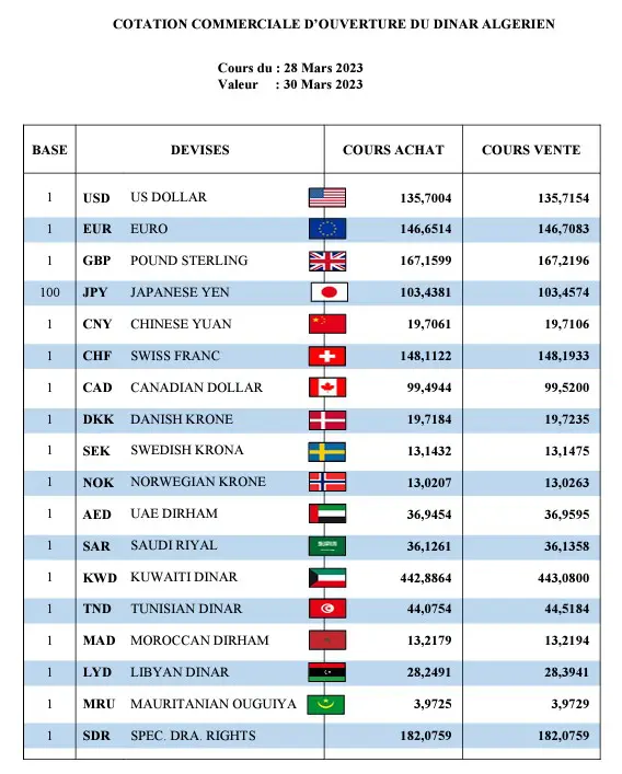 Ainsi, le tableau ci-dessous récapitule les cotations de la monnaie nationale face aux principales devises étrangères ce mercredi 29 mars 2023 :