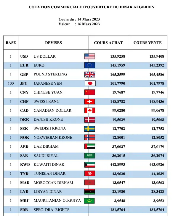 Les cotations commerciales d’ouverture du dinar algérien à la Banque d’Algérie du 14 au 16 mars 2023 affichent la monnaie européenne unique à 145.19 dinars algériens à l’achat et à 145.23 dinars algériens à la vente. De plus, les cours de change du marché officiel indiquent que le dollar américain unique s’achète à 135.92 dinars algériens et qu’il se vend à 135.94 dinars algériens.